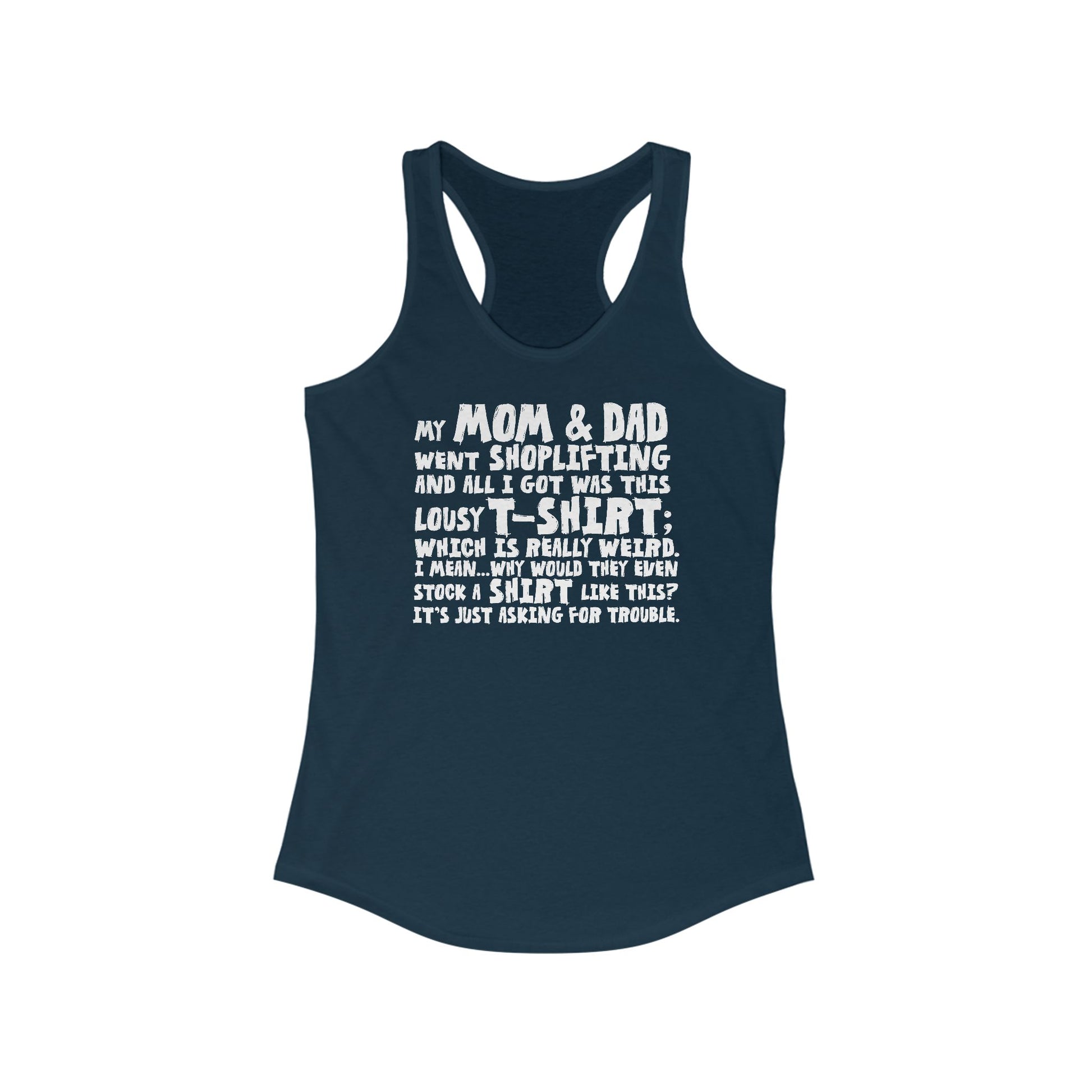 My Mom & Dad Went Shoplifting And All I Got Was This Lousy T-Shirt; Which Is Really Weird. I Mean... Why Would They Even Stock A Shirt Like This? It's Just Asking For Trouble. - Women’s Racerback Tank